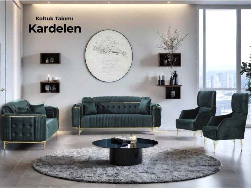 Klasik şıklığı modern çizgilerle buluşturan Kardelen Koltuk Takımı, zarif detayları ve altın renkli ayak tasarımıyla yaşam alanlarınıza prestij katıyor. Derin yeşil tonu, yumuşak dokusu ve konforlu yapısıyla hem göz alıcı bir duruş sergiler hem de gün boyu rahatlık sunar. Estetik ve konforu bir araya getiren özel bir tasarım.